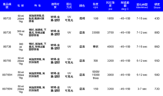 807系列为单液UV可见光硬化之接着剂, 可经由照射足够能量及特定波长之紫外光而固化.